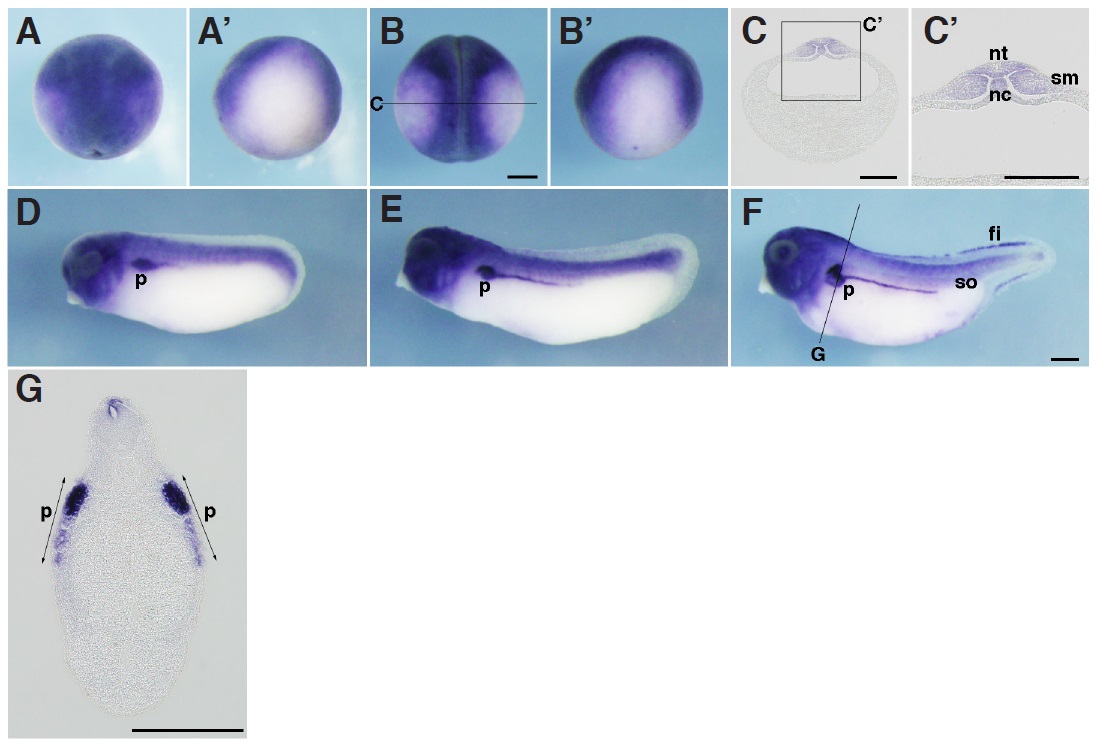Fig. 3.In situ hybridization analysis of igfbp2 during X. tropicalis development. (A,Aâ) Stage 15 (B,Bâ) stage 20 (A,B) dorsal view (Aâ,Bâ) lateral view (C,Câ) Transversal section of an embryo at stage 20. (Câ) Magnified view of the boxed area in (C). (D) Stage 25 (E) stage 30 (F) stage 35 (G) transversal section of an embryo at stage 35. Positions of sections are indicated by black lines, and letters mark corresponding panels. nt, neural tube; nc, notochord; sm, somatic mesoderm; p, pronephric tubule; so, somite; fi, fin. Scale bars indicate 200 mm.