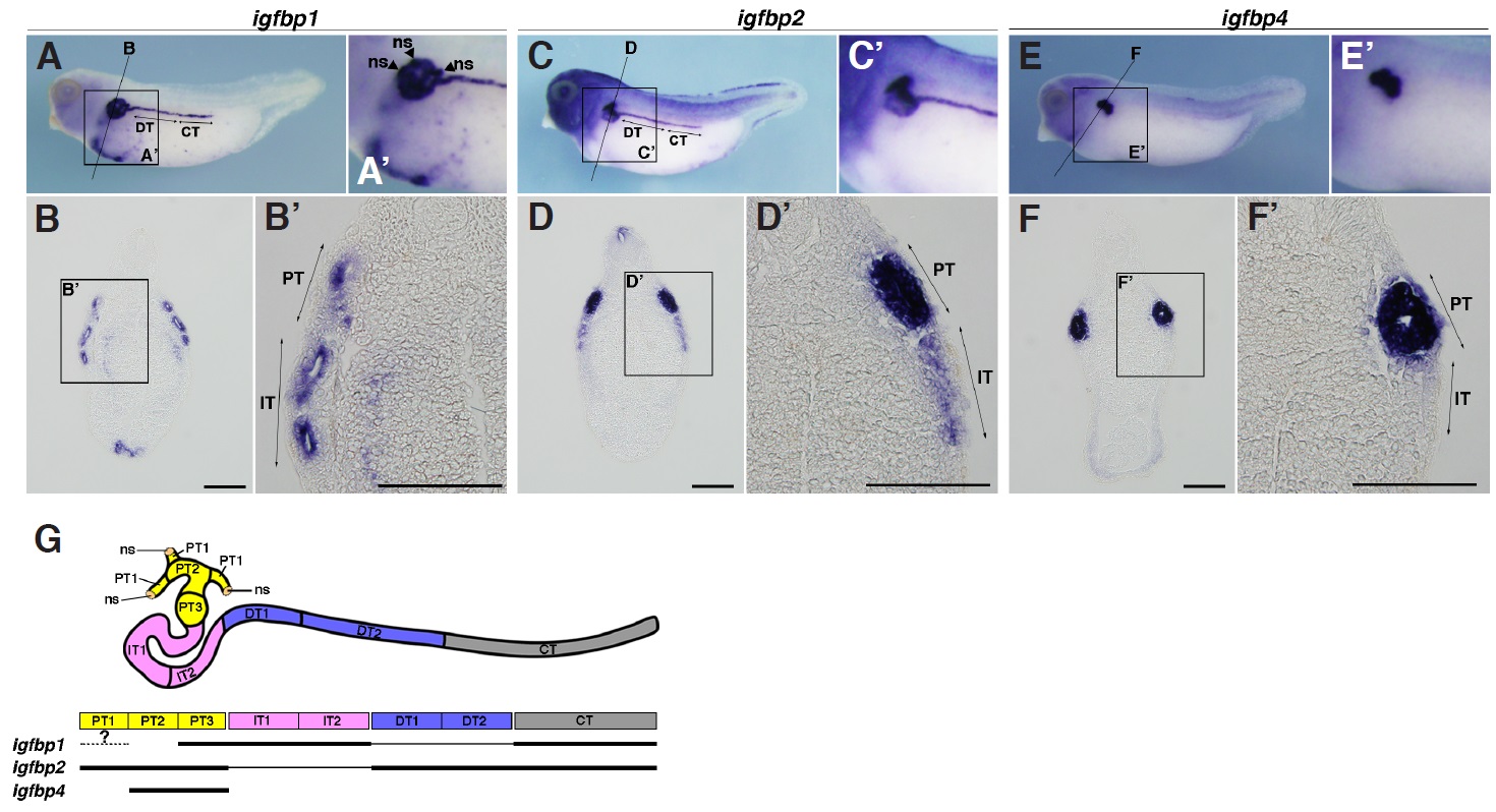Fig. 6. Comparative expression patterns of igfbps in pronephros development. (A-B’) igfbp1 (C-D’) igfbp2 (E-F’) igfbp4 expressions at stage 35 (A’,B’,C’,D’,E’,F’) magnified view of the boxed area in (A,B,C,D,E,F), respectively. (B,B’,D,D’,F,F’) Transversal sections. Positions of sections are indicated by black lines, and letters mark corresponding panels. (G) Summary of igfbp expression in pronephros. This is a modified illustration. The original schematic diagram was described in Raciti et al., (2008). The thickness of lines represents the intensity of staining by whole-mount in situ hybridization. ns, nephrostome; PT, proximal tubule; IT, intermediate tubule; DT, distal tubule; CT, connecting tubule; ns, nephrostome. Scale bars indicate 200 mm.