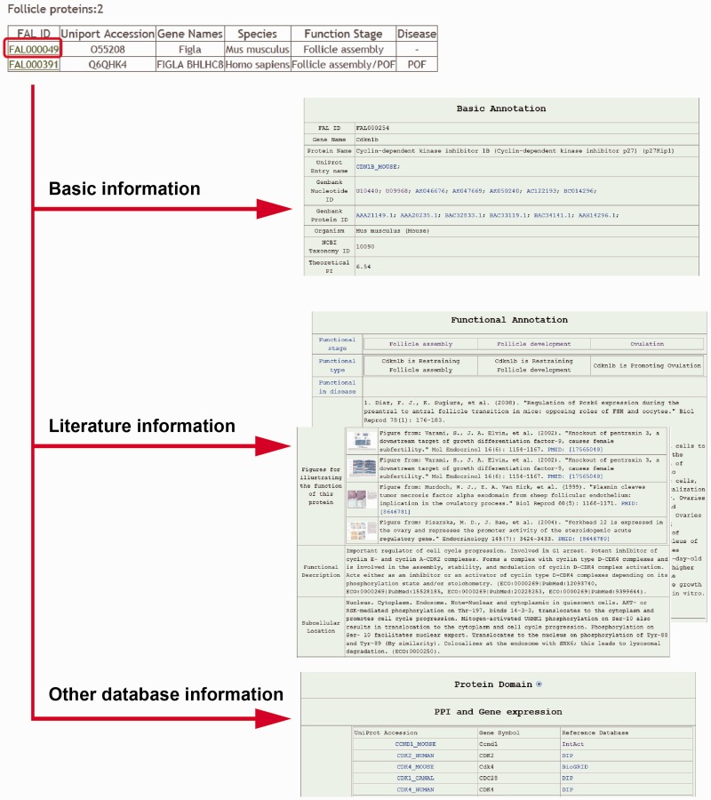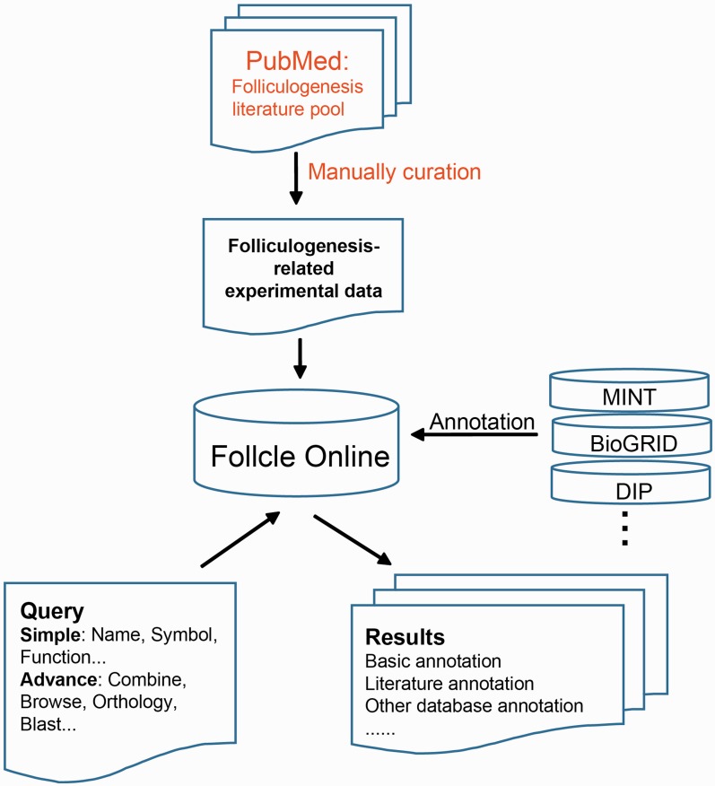 Folliculogenesis is an important part of ovarian function as it provides the oocytes for female reproductive life. Characterizing genes/proteins involved in folliculogenesis is fundamental for understanding the mechanisms associated with this biological function and to cure the diseases associated with folliculogenesis. A large number of genes/proteins associated with folliculogenesis have been identified from different species. However, no dedicated public resource is currently available for folliculogenesis-related genes/proteins that are validated by experiments. Here, we are reporting a database 'Follicle Online' that provides the experimentally validated gene/protein map of the folliculogenesis in a number of species. Follicle Online is a web-based database system for storing and retrieving folliculogenesis-related experimental data. It provides detailed information for 580 genes/proteins (from 23 model organisms, including Homo sapiens, Mus musculus, Rattus norvegicus, Mesocricetus auratus, Bos Taurus, Drosophila and Xenopus laevis) that have been reported to be involved in folliculogenesis, POF (premature ovarian failure) and PCOS (polycystic ovary syndrome). The literature was manually curated from more than 43,000 published articles (till 1 March 2014). The Follicle Online database is implemented in PHP + MySQL + JavaScript and this user-friendly web application provides access to the stored data. In summary, we have developed a centralized database that provides users with comprehensive information about genes/proteins involved in folliculogenesis. This database can be accessed freely and all the stored data can be viewed without any registration. Database URL: http://mcg.ustc.edu.cn/sdap1/follicle/index.php