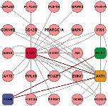 Figure 4. An example of potential protein network of folliculogenesis. The proteins in square frame (ESR1, PDK1, AKT1 and PTEN) are reported to participate in folliculogenesis. The proteins in circle are predicted to interact with the four proteins (in square boxes) either directly or indirectly. Red lines represents the experimentally verified interactions. Although the grey line shows the predicted interactions of proteins by our database.