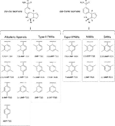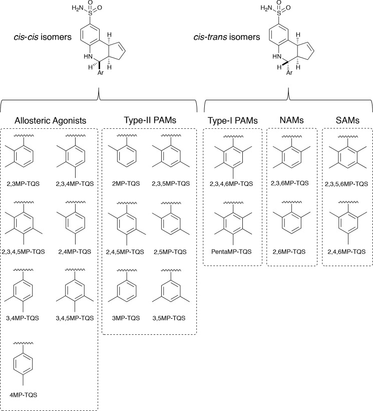 FIGURE 1. Chemical structures of α7 nAChR allosteric modulators. On the basis of experimental data obtained in the present study, compounds have been classified as allosteric agonists, desensitizing (type I) PAMs, nondesensitizing (type II) PAMs, NAMs, or SAMs. Compounds differ only in the pattern of methyl substitution at a single aromatic ring (designated Ar in the figure). Information concerning the ratio of cis-cis- and cis-trans-diastereoisomers obtained during synthesis is provided in the supplemental materials.