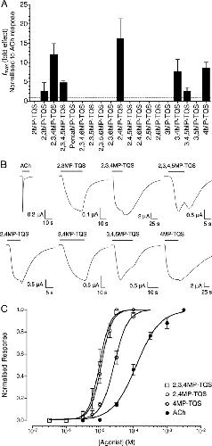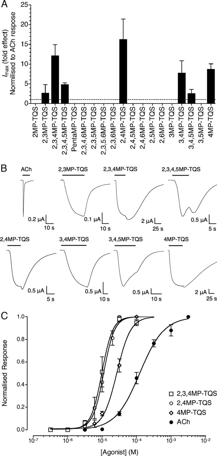 A, bar graph illustrating agonist responses observed with 100 μm of each compound. Responses are normalized to the average response obtained upon application of acetylcholine alone at a maximum effective concentration (3 mm). Data are means ± S.E. of 3–15 independent experiments (Table 1). B, representative recordings are shown illustrating responses to the application of acetylcholine (3 mm) and of the allosteric agonists (100 μm). The horizontal lines indicate the duration of agonist applications. Responses have been normalized to their peak response. C, concentration-response data are presented for a range of concentrations of 2,3,4MP-TQS (open squares), 2,4MP-TQS (open circles), 4MP-TQS (open diamonds), and acetylcholine (closed circles). Data are means ± S.E. of at least three independent experiments, each from different oocytes. Data are normalized to agonist-induced responses induced by the maximal effective concentration.
