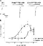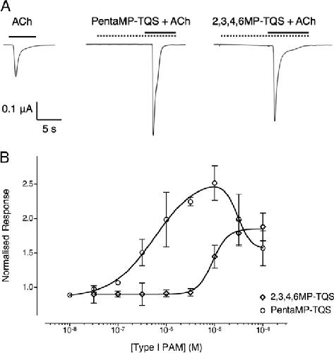 A, representative recordings are shown illustrating responses to the application of acetylcholine (100 μm) alone or to a maximal concentration of the PAM (PentaMP-TQS 10 μm; 2,3,4,6MP-TQS 100 μm) preapplied for 10 s and then co-applied with acetylcholine (100 μm). Solid horizontal lines indicate the application of acetylcholine, and dotted horizontal lines indicate the application of the PAM. B, concentration-response data are presented for a range of concentrations of 2,3,4,6MP-TQS (open diamonds) and PentaMP-TQS (open circles) on responses evoked by a submaximal (EC50) concentration of acetylcholine with wild-type α7 nAChRs. The PAM was preapplied for 10 s and then co-applied with acetylcholine (100 μm). Data are means ± S.E. of at least three independent experiments, each from different oocytes. Data are normalized to a submaximal (EC50) concentration of acetylcholine (100 μm).