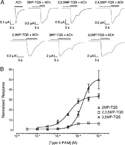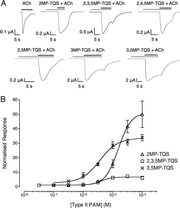 A, representative recordings are shown illustrating responses to the application of acetylcholine (100 μm) and a maximal concentration of the PAM (100 μm) preapplied for 10 s and then co-applied with acetylcholine (100 μm). Solid horizontal lines indicate the application of acetylcholine, and dotted horizontal lines indicate the application of the PAM. Responses have been normalized to their peak response. B, concentration-response data are presented for a range of concentrations of 2MP-TQS (open triangles), 2,3,5MP-TQS (open squares), and 3,5MP-TQS (crosses) on responses evoked by a submaximal (EC50) concentration of acetylcholine (100 μm) with wild-type α7 nAChRs. The PAM was preapplied for 10 s and then co-applied with acetylcholine (100 μm). Data are means ± S.E. of at least three independent experiments, each from different oocytes. Data are normalized to a submaximal (EC50) concentration of acetylcholine (100 μm).