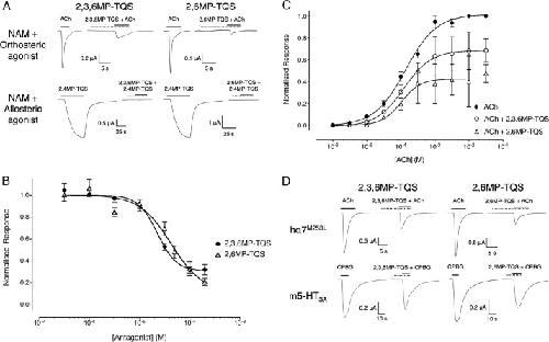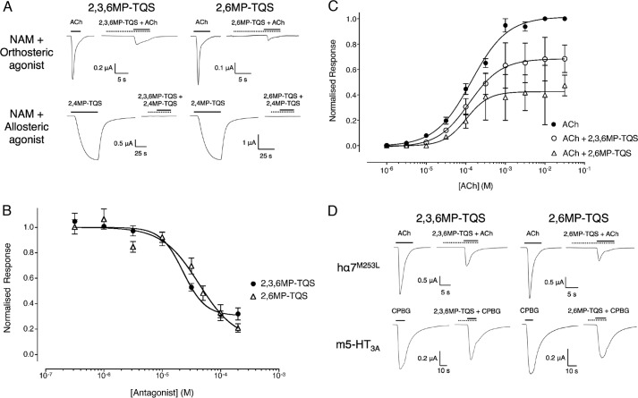 A, representative recordings are shown illustrating responses with wild-type α7. In the top panel, Orthosteric agonist indicates the application of acetylcholine (100 μm) and a maximal concentration of the antagonist (200 μm) preapplied for 10 s and then co-applied with acetylcholine (100 μm). In the bottom panel, Allosteric agonist indicates the application of 2,4MP-TQS (10 μm) and a maximal concentration of the antagonist (200 μm) preapplied for 10 s and then co-applied with 2,4MP-TQS (10 μm). Solid horizontal lines indicate the application of the agonist, and dotted horizontal lines indicate the application of the NAM. B, concentration-response data are presented illustrating the ability of 2,3,6MP-TQS (filled circles) and 2,6MP-TQS (open triangles) to inhibit responses evoked by a submaximal (EC50) concentration of acetylcholine (100 μm) on wild-type α7. The antagonist was preapplied for 10 s and then co-applied with acetylcholine (100 μm). Data are means ± S.E. of at least three independent experiments, each from different oocytes. Data are normalized to a submaximal (EC50) concentration of acetylcholine (100 μm). C, both 2,3,6MP-TQS and 2,6MP-TQS are noncompetitive antagonists of acetylcholine. Concentration-response data are presented for a range of concentrations of acetylcholine acting on wild-type α7 nAChRs in either the absence (filled circles) or presence of 20 μm 2,3,6MP-TQS (open circles) or 40 μm 2,6MP-TQS (open triangles). In all cases the antagonist was preapplied for 10 s and then co-applied with acetylcholine. Data are means ± S.E. of at least three independent experiments, each from different oocytes. Data are normalized to acetylcholine (3 mm). D, in the top panels, representative recordings are shown illustrating responses on α7M253L to the application of acetylcholine (100 μm) (left panel) and a maximal concentration of the antagonist (200 μm) preapplied for 10 s and then co-applied with acetylcholine (100 μm) (right panel). In the bottom panels, the same protocol was used for the 5-HT3A receptors except CPBG (1 μm) was used as the agonist instead of acetylcholine. Solid horizontal lines indicate the application of CPBG, and dotted horizontal lines indicate the application of the PAM.