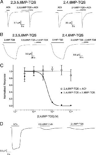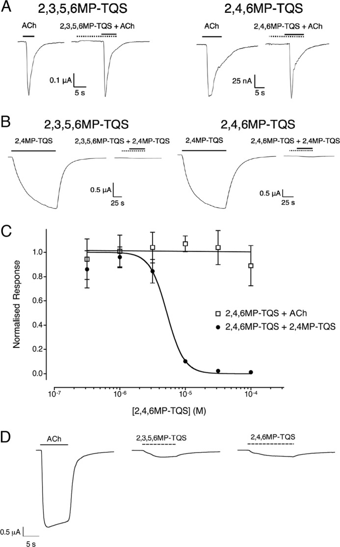 A, representative recordings are shown illustrating responses to the application of acetylcholine (100 μm) (left panel) and a maximal concentration of the SAM (100 μm) preapplied for 10 s and then co-applied with acetylcholine (100 μm) (right panel). B, representative recordings are also shown illustrating responses to the application of 2,4MP-TQS (10 μm) (left panel) and a maximal concentration of the SAM (100 μm) preapplied for 10 s and then co-applied with 2,4MP-TQS (100 μm) (right panel). Solid horizontal lines indicate the application of acetylcholine, and dotted horizontal lines indicate the application of the SAM. C, concentration-response data are presented illustrating the ability of 2,4,6MP-TQS to have no effect on a submaximal (EC50) concentration of acetylcholine (100 μm) (□) but to inhibit responses evoked by a submaximal (EC50) concentration of 2,4MP-TQS (10 μm) (●). The compound was preapplied for 10 s and then co-applied with either agonist. Data are means ± S.E. of at least three independent experiments, each from different oocytes. Data are normalized to a submaximal (EC50) concentration of either acetylcholine (100 μm) or 2,4MP-TQS (10 μm). D, the α7 nAChR transmembrane mutation L247T converts SAMs (2,3,5,6MP-TQS and 2,4,6MP-TQS) into agonists. Representative recordings are shown illustrating responses to the application of acetylcholine (10 μm) (left panel), 2,3,5,6MP-TQS (10 μm) (middle panel), and 2,4,6MP-TQS (10 μm) (right panel) on α7L247T nAChRs. Solid horizontal lines indicate the application of acetylcholine, and dotted horizontal lines indicate the application of the SAM.
