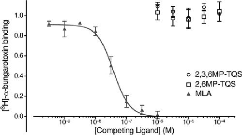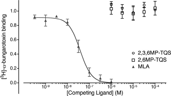 FIGURE 7. Competition radioligand binding on tsA201 cells transiently co-transfected with human α7 nAChR cDNA and C. elegans RIC-3 cDNA. Equilibrium radioligand binding was performed with [3H]α-bungarotoxin (10 nm) in the presence of varying concentrations of competing ligands (MLA or allosteric modulators). No significant displacement of [3H]α-bungarotoxin was observed with any of the 19 methyl-substituted compounds up to the maximum texted (100 μm). (Note that for simplicity, data are shown only for two allosteric modulators (2,3,6MP-TQS and 2,6MP-TQS).) In contrast to the findings with allosteric modulators, complete displacement of [3H]α-bungarotoxin was observed with the orthosteric ligand MLA. Data are means of triplicate samples from a single experiment, from three independent experiments ± S.E. Data are normalized to the maximal [3H]α-bungarotoxin binding.