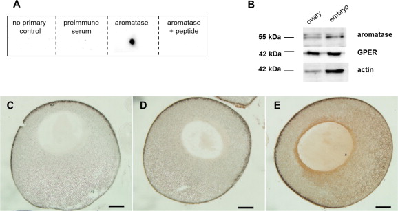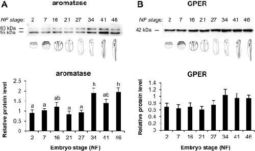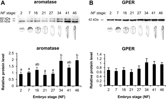 Aromatase and GPER are expressed throughout early S. tropicalis embryogenesis. Western blots and corresponding densitometry analysis demonstrate an overall increase in the amount of (A) aromatase and (B) GPER around NF34 (significant only in the case of aromatase). The densitometric analysis is reported as an arbitrary value relative to a positive control sample (ovarian tissue) ± SEM. For each stage, animals were pooled in groups of 20 (r = 6) prior to protein isolation.