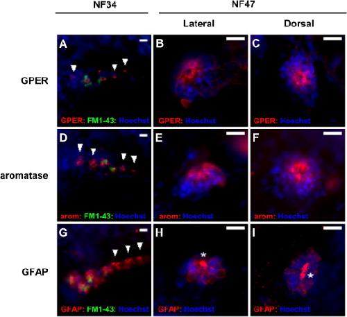 GPER (top row, red), aromatase (middle row, red) and the glial cell marker GFAP (bottom row, red) expression in developing neuromasts of NF34 (first column) and NF47 (second and third columns) larvae. All larvae were counter-stained with the nuclear dye Hoechst 33342 (blue). Also shown in NF34 larvae is the result of the co-staining of FM1–43 (green) dye which specifically labels hair cells. In NF34 larvae (A, D, G), GPER, aromatase and GFAP are present in developing neuromasts including those which are FM1–43 negative (arrowheads). In NF47 tadpoles, the expression of GPER (B, C) and aromatase (E, F) is primarily in the overlaying mantle cells of the neuromasts, while the expression of GFAP (H, I) is primary detected in the underlying support cells. There is also some expression of GPER in the hair cells. Note the strong expression of the glial cell marker GFAP in the microvilli of the support cells which extend out of the apical regions of the support cells (asterisk). arom = aromatase, scale bar = 25 μM.