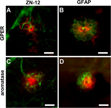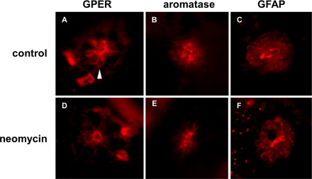 Whole-mount immunofluorescence of neuromasts of NF47 larvae double-stained with GPER (red, first row) or aromatase (red, bottom row) and the afferent nerve specific antibody ZN-12 (green, first column) or the glial cell specific marker GFAP (green, second column). (A) GPER (red) is expressed primarily in the mantle cells of the neuromast and shows no co-localization with ZN-12 (green) indicating that it is not present in the nerve fibers that innervate the neuromast. (B) GPER (red) is expressed in the mantle cells and shows little co-localization with GFAP (green) which is expressed predominately in the supporting cells. (C) Aromatase (red) is expressed in the mantle cells and shows no co-localization in the afferent nerve fibers labeled with ZN-12 (green). (D) Aromatase (red) is expressed in the mantle cells and shows little co-localization in the supporting cells which are labeled with GFAP (green). Scale bars = 25 μm.
