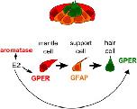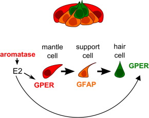 Diagrammatic representation of the expression of aromatase, GPER and GFAP in the neuromast and the possible autocrine and paracrine actions of estradiol-17β (E2) in this system; E2 is synthesized by aromatase in the mantle cells and acts on GPER in both the mantle and the hair cells to regulate cell proliferation (Image adapted from Ghysen and Dambly-Chaudiere (2007)).
