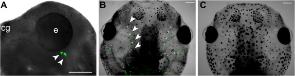Neuromast localization using the hair cell specific dye, FM1–43. Examples of FM1–43 stained neuromasts (green) are depicted with the thick white arrows. Only two neuromasts have developed at NF34 (A) and are present at the dorsal margin of the eye (e). By NF47 (B) the neuromasts have developed and migrated along the head (B). (C) Following exposure to 200 μM neomycin, the hair cells are obliterated and are no longer stained with FM1–43. cg = cement gland, scale bar = 200 μm.