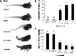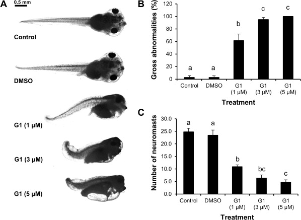 Exposure of embryos to varying doses of G-1 causes (A, B) severe developmental abnormalities (shortened total length, axial curvature, pericardial/yolk sac edema, craniofacial abnormalities) and (B) a decrease in the total number of neuromasts present in the lateral line, in a dose-dependent manner and (C) a decrease in the total number of neuromasts present in the lateral line, in a dose-dependent manner.