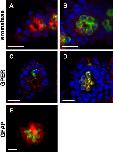 Double-staining of aromatase, GPER or GFAP with FM1–43 in NF47 tadpoles imaged with confocal microscopy (A–D) or light microscopy (E). (A) Superficial plane of neuromast shows that aromatase (red) is expressed primarily in the apical region of the mantle cells. (B) Mid-section plane of neuromast shows that aromatase (red) is not co-localized with FM1–43 (green) and therefore is not present in the hair cells. (C) Superficial plane of neuromast shows GPER (red) is expressed in the mantle cells. (D) Mid-section plane of neuromast shows that GPER (red) is co-localized (yellow) with FM1–43 (green), thus it is also present in the hair cells. (E) The glial-cell marker GFAP (red), is expressed primarily in the supporting cells, particularly in the microvilli and is not co-localized with FM1–43 (green). Blue = Hoechst 33342 nuclear stain. Scale bar = 25 μm.