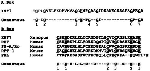 sequence (1). The B Box of XNF7 (aa 224-255) is aligned with the similar