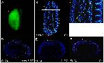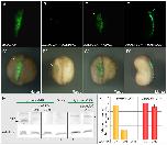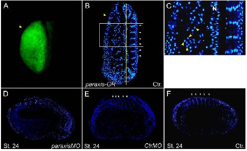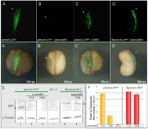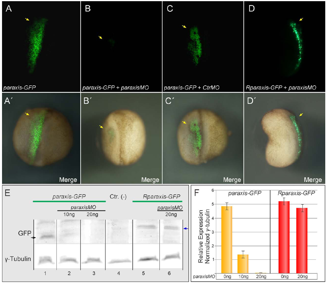 Fig. 1. Efficiency of paraxis antisense morpholino oligonucleotide. AâD: Dorsal views of Xenopus laevis embryos under a fluorescence stereoscopic microscope; anterior side is uppermost. Yellow arrows indicate the injected side. A: Embryos injected with mRNA that encoding paraxisâGFP (0.4 ng/embryo) showing GFP fluorescence. B: Embryos co-injected with paraxisâGFP mRNA (0.4 ng/embryo) and paraxisMO (30 ng/embryo). paraxisMO inhibits in vivo expression of paraxis-GFP. C: Embryos coinjected with paraxisâGFP mRNA (0.4 ng/embryo) and CtrMO (30 ng/embryo). D: Embryos coinjected with mRNA that encoding RparaxisâGFP (0.4 ng/embryo) and paraxisMO (30 ng/embryo) showing GFP fluorescence. The expression of Rparaxis-GFP was not affected by the presence of paraxisMO. A'âD': Fluorescence and clear field images of each embryo are superposed and shown in merged images. E: Western blot assay, paraxisMO inhibits translation of paraxis-GFP in a dose-dependent manner (lane 1â3) while the expression of Rparaxis-GFP was not affected. Black and blue arrow indicate Paraxis-GFP and Resparaxis-GFP protein product, respectively. g-Tubulin was used as loading control. The negative control was performed using uninjected embryos. F: Densitometric analysis of the expression of GFP show in E. Ctr.(-), negative control.