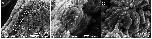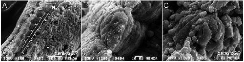 Fig. 4. SEM analysis of Xenopus somitogenesis in paraxis overexpression experiments. Dorsal views of Xenopus embryos at the tail-bud stage. Embryos were unilaterally injected with 1 ng of paraxis-GR mRNA together with the lineage tracer FDA. A: paraxis overexpression leads to the formation of irregular intersomitic boundaries and a lengthening of the somites (indicated by brackets) that was not observed in control side (indicated by brackets). B: Magnification of control side of A at the level of white arrowhead. C: Magnification of morphant side of A at the level of white arrowhead. N, notochord.