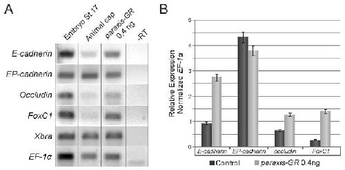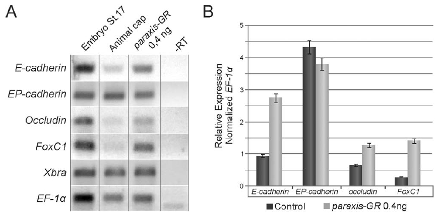 Fig. 9. Overexpression of paraxis increases cell adhesion. A: RT-PCR semiquantitative analysis of adhesion markers in animal cap explants obtained from embryos injected with 0.4 ng of paraxis-GR mRNA and cultured in the presence of Activin A and dexamethasone until stage 17. Injected explants cultured in the absence of dexamethasone were used as caps control, the positive control consisting of whole embryos at stage 17. The gain of function of paraxis causes an increase in the expression of molecules involved in cell adhesion. B: Densitometric analysis of the expression of adhesion molecules show in A. âRT, negative control.