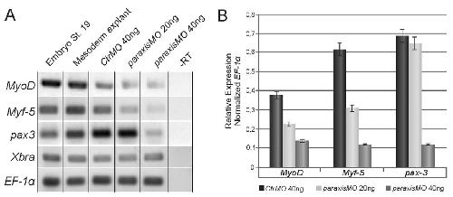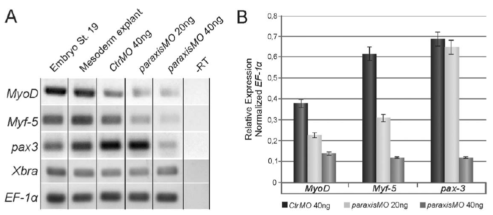 Fig. 11. Quantification of the effect of paraxis knockdown on myogenic expression in mesoderm explants assay. A: RT-PCR semiquantitative analysis of expression of myogenic markers in mesoderm explants obtained from embryos injected with 20 and 40 ng of paraxisMO, 40 ng of CtrMO or uninjected embryos. Loss of function of paraxis causes a dose-dependent decrease in the expression of myogenic markers. B: Densitometric analysis of A. âRT, negative control.