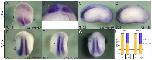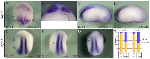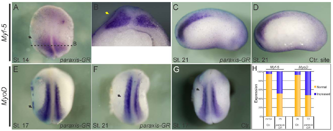 Fig. 12. Gain of function of paraxis increases myogenic markers expression. Embryos were unilaterally injected with 1 ng of paraxis-GR mRNA and processed for in situ hybridization assay. AâC,EâF: The gain of function of paraxis increases the expression of myogenic markers Myf-5 and MyoD (indicated by arrow). B: Transverse section at level of the dotted line. D: Control side of C. G: Control embryo cultured in the absence of dexamethasone. H: Numerical summary illustrating penetrance of gain of function of paraxis in myogenic markers expression.
