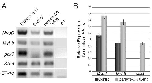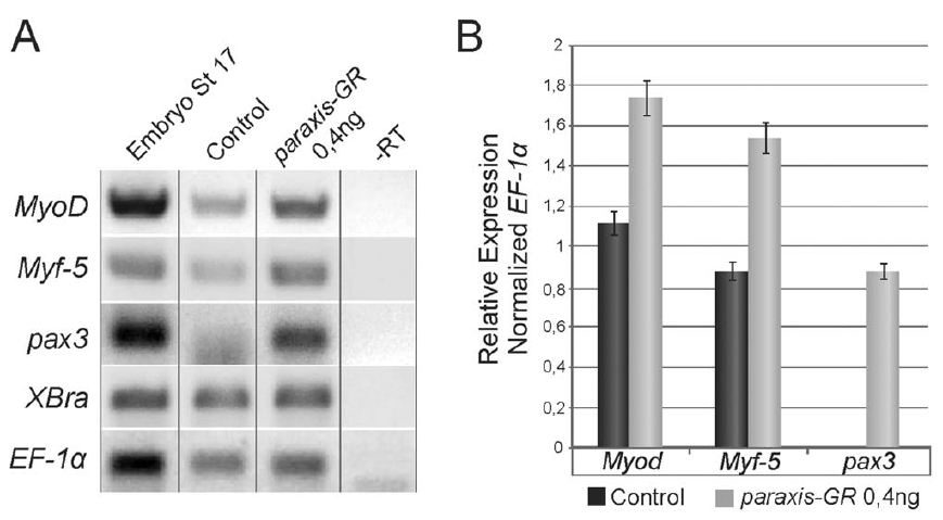 Fig. 13. Quantification of the effect of paraxis gain of function on myogenic markers expression in animal caps assay. A: RT-PCR semiquantitative analysis of myogenic markers in animal cap explants obtained from embryos injected with 0.4 ng of paraxis-GR mRNA and cultured in the presence of Activin A and dexamethasone. Injected explants cultured in the absence of dexamethasone were used as caps control. The gain of function of paraxis causes an increase in the expression of MyoD and Myf-5 genes and is capable of inducing pax3 expression in the animal caps tissue. B: Densitometric analysis of A. âRT, negative control.