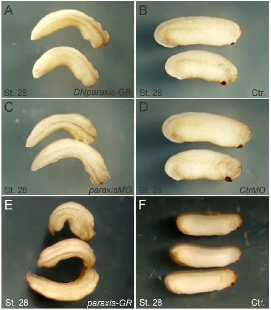 Fig. 2. Gross morphology of embryos in experiments of loss and gain function of paraxis gene. Embryos were unilaterally injected with 0.5 ng of DNparaxis-GR mRNA (A), 25 ng of paraxisMO (C), 25 ng of CtrMO (D), or 1 ng of paraxis-GR mRNA (E). B,F: Uninjected control embryos. The alteration of the expression of paraxis in the paraxial mesoderm leads to curvature of anteroposterior axis of the embryos.