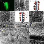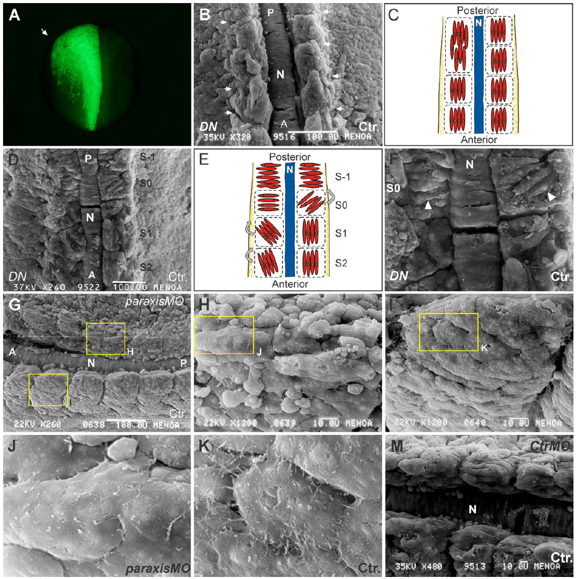 Fig. 3. SEM analysis of Xenopus somitogenesis in paraxis knockdown experiments. Dorsal views of Xenopus embryos at the tail-bud stage. Embryos were unilaterally injected with 1 ng of DNparaxis-GR mRNA (B,D,F), 40 ng of paraxisMO (GâK) or 40 ng of CtrMO (M) together with the lineage tracer FDA. A: The injected side of the embryos was determined by observing the fluorescence of FDA. B: Knockdown of paraxis using DNparaxis-GR leads to the formation of irregular intersomitic boundaries and sometimes fusion of somites was observed. White arrows indicate intersomitic boundaries. C: Schematic representation of B. D: Knockdown of paraxis causes a delay in the rotation of somitic cells during somitogenesis. E: Schematic representation of D. F: Enlargement of D at the level of the transition zone (S0). White arrowheads indicate the orientation of presomitic cells. G: Loss of function of paraxis using paraxisMO morpholino leads to severe cellular disorganization. H,I: Micrographs of the somite injected with paraxis-MO and of uninjected control side, respectively, in which is observed the dermatome cells. J,K: Enlargement of H and I, respectively, in which filopodial extensions are shown. M: Uninjected control embryos. A, anterior; N, notochord; P, posterior; S, somite numbers, according to the nomenclature of somitogenesis (Pourquie and Tam, 2001).