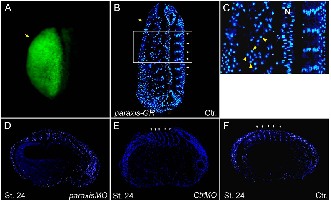 Fig. 5. Analysis of nuclear organization of myotomal cells in experiments of gain and loss of function of the paraxis gene. Sections were obtained from tail-bud stage embryos unilaterally injected with 1 ng of paraxis-GR mRNA (B,C), 40 ng of paraxisMO (D) or 40 ng of CtrMO (E) together with the lineage tracer FDA. B,C: Frontal section with anterior side uppermost; (DâF) parasagittal section with anterior side to the right. A: The injected side of the embryos was determined by observing the fluorescence of FDA. B: The overexpression of paraxis leads a loss of nuclear organization. Yellow arrows indicate the injected side and white arrows indicate the alignment of nuclei miotomal cells (control side). C: Enlargement of B at the level of white rectangle, wherein is observed the rounded shape of the cells nuclei of the treated side of the embryo (yellow arrowheads). D: Loss of function of paraxis leads to a severe disorganization of myotomal nuclei. E: The microinjection of CtrMO does not affect nuclear organization. F: Uninjected control embryos. N, notochord.