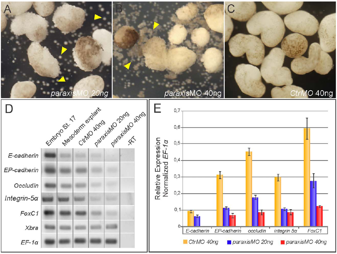 Fig. 6. Cell adhesion assay in mesoderm explants. The explants were obtained from gastrula embryos bilaterally injected with 20 ng of paraxisMO (A), 40 ng of paraxisMO (B) or 40 ng of CtrMO (C) and cultured until stage 17. A,B: knockdown of paraxis gene leads to disaggregation cell of the mesoderm explants tissue. Yellow arrows indicate disaggregating cells. C: Control mesoderm explants. D: RT-PCR semiquantitative analysis in mesoderm explants. Whole embryos and mesoderm explants from uninjected embryos were used as positive control and explants control, respectively. Knockdown paraxis causes a dose-dependent decrease in the expression of adhesion molecules. E: Densitometric analysis of the expression of adhesion molecules show in D. âRT, negative control.