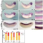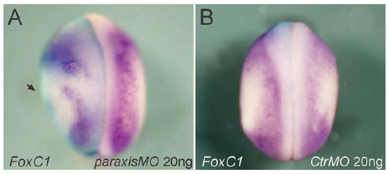 Fig. 7. paraxis knockout disrupts the expression of the cell adhesion marker FoxC1. Embryos were unilaterally injected with 20 ng of paraxisMO or 20 ng of CtrMO, cultured until neurula stage and subsequently processed for in situ hybridization assay. A: The loss of function of paraxis reduces the expression of the FoxC1 gene in PSM (indicated by arrow). B: Control embryo injected with CtrMO.
