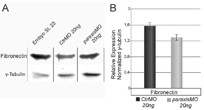 Fig. 8. paraxis knockout reduces the Fibronectin expression. Embryos were bilaterally injected with 20 ng of paraxisMO or 20 ng of CtrMO, cultured until tail-bud stage and subsequently processed for western blot assay. A: The loss of function of paraxis leads to a mild reduction of Fibronectin expression. g-Tubulin was used as loading control. B: Densitometric analysis of the expression of Fibronectin shown in A.