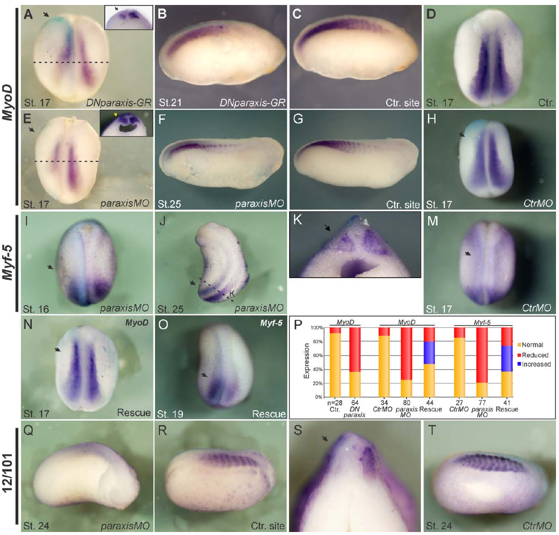 Fig. 10. paraxis depletion disrupts the expression of myogenic markers. Embryos were unilaterally injected with 1 ng of DNparaxis-GR mRNA (AâD), 40 ng of paraxisMO (EâG, IâK, and QâS), 40 ng of CtrMO (H, M and T), or a blend of 40 ng of paraxisMO and 0.2 ng of Rparaxis-GFP mRNA (N and O), and subsequently processed for in situ hybridization assay (AâO) or immunohistochemical (QâT). AâC,EâG: The loss of function of paraxis reduces the expression of the MyoD myogenic marker in PSM and somites (indicated by arrow). D: Control embryo injected with the DNparaxis- GR mRNA and cultured in the absence of dexamethasone. H: CtrMO morpholino does not affect the expression of MyoD myogenic marker. I,J: The loss of function of paraxis reduces the expression of Myf-5 myogenic marker. K: Transverse section at the dotted line of J. M: CtrMO does not affect the expression of Myf-5. N,O: The downregulation of MyoD and Myf-5 expression by paraxisMO is rescued by coinjection with Rparaxis-GR construct. P: Numerical summary illustrating the penetrance of effect of paraxis knockdown and the rescue of myogenic markers expression. Q: The loss of function of paraxis reduces the expression of the 12/101 myogenic marker. R: Control side of Q. S: Transverse section of Q. T: Control embryo. Insets A and E, transverse section at the dotted line.
