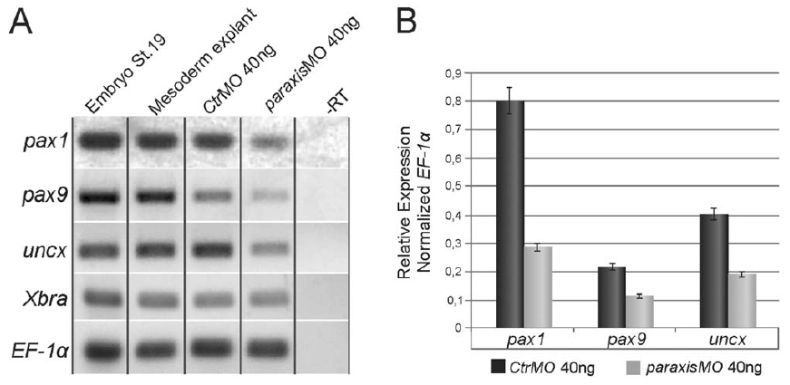 Fig. 15. Quantification of the effect of paraxis knockdown on chondrogenic expression in mesoderm explants assay. A: RT-PCR semiquantitative analysis of chondrogenic markers in mesoderm explants obtained from embryos injected with paraxisMO, CtrMO or uninjected. The loss function of paraxis causes a decrease in the expression of pax1, pax9, and uncx chondrogenic markers. B: Densitometric analysis of A. âRT, negative control.