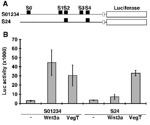 Wnt3a, also activates the S24 siamois promoter mutated at the S0, S1 and S3 Tcf/Lef-binding sites.
