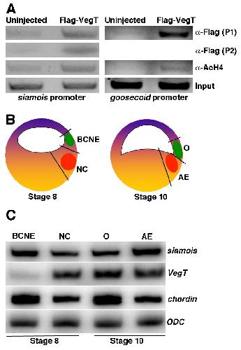 VegT and siamois at blastula and gastrula stages. (A) ChIP assays were performed using early