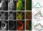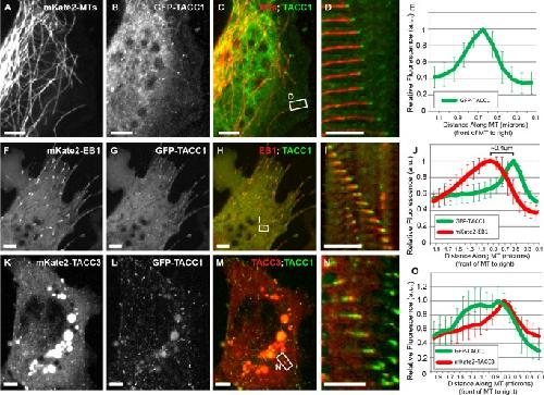 Figure 1. TACC1 can act as a plus‐end tracking protein in embryonic cells. Expression of mKate2‐tubulin (A), GFP‐TACC1 (B), and merge (C) in cultured mesenchymal cells derived from embryonic neural tube; see also Movies S1 in Supporting Information. (D) Magnified time‐lapse montages of the boxed region in panel C. The time interval between frames is 2.9 s. (E) Fluorescence intensity profile of GFP‐TACC1. Signals from 20 individual MTs were quantified by intensity line scans to present the relative fluorescence intensity profiles, with the plus‐end of the MT toward the right. Expression of mKate2‐EB1 (F), GFP‐TACC1 (G), and merge (H) in cultured embryonic mesenchymal cells; see also Movie S3 in Supporting Information. (I) Magnified time‐lapse montage of the boxed region in panel H. The time interval between frames is 2.7 s. For this panel, the green channel has been translated to the left by 0.27 µm to account for the different acquisition times of the red and green channels (the velocity of the plus‐end was consistently moving at 0.27 µm/s in this time series, and the green channel was imaged 1 s after the red channel). This allows for a more accurate visualization of colocalization between the two +TIPs. This demonstrates that, even after correcting for the time displacement, GFP‐TACC1 overlaps with and is distal to mKate2‐EB1. (J) Fluorescence intensity profiles of GFP‐TACC1 and mKate2‐EB1. Signals from 18 MTs were quantified by intensity line scans to present the relative fluorescence intensity profiles, with the plus‐end of the MT toward the right. For each measurement, the green channel has been translated to the left (approximately 0.2 µm) based on each individual MTs velocity, to account for the time displacement between channels. After the correction, the highest peak intensity of GFP‐TACC1 is ∼0.4 μm distal to the peak of mKate2‐EB1. Expression of mKate2‐TACC3 (K), GFP‐TACC1 (L), and merge (M) in cultured embryonic mesenchymal cells; see also Movie S4 in Supporting Information. (N) Magnified time‐lapse montage of the boxed region in panel M. The time interval between frames is 3.9 s. For this panel, the green channel has been translated to the left by 0.25 μm to account for the different acquisition times of the red and green channels (the velocity of the plus‐end was consistently moving at 0.21 µm/s in this time series, and the green channel was imaged 1.2 s after the red channel). (O) Fluorescence intensity profiles of GFP‐TACC1 and mKate2‐TACC3. Signals from 12 MTs were quantified by intensity line scans to present the relative fluorescence intensity profiles, with the plus‐end of the MT toward the right. For each measurement, the green channel has been translated to the left (approximately 0.1 µm) based on each individual MTs velocity, to account for the time displacement between channels. While mKate2‐TACC3 and GFP‐TACC1 mostly overlap, the peak of mKate2‐TACC3 is just slightly distal to GFP‐TACC1. Also, we found that GFP‐TACC1 comets were consistently longer when mKate2‐TACC3 was expressed. Note that mKate2‐TACC3 is less effective at tracking MT plus‐ends than GFP‐TACC3 [observed in Nwagbara et al., 2014]. One reason for this is that the presence of the mKate2 tag leads to more efficient cleavage of the C‐terminal TACC domain (not shown), which is required for MT plus‐end tracking. Moreover, note that in images K–M, yolk granules are strongly autofluorescing. Bar 5 µM.