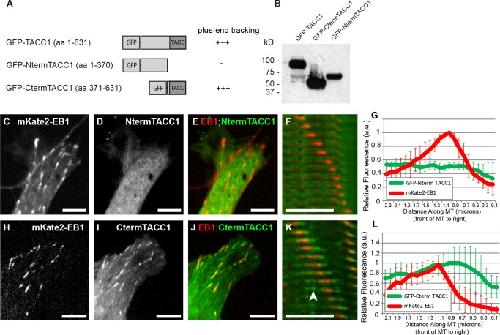 Figure 2. The C‐terminal TACC domain is necessary and sufficient for MT plus‐end tracking. (A) Schematic representation of GFP‐tagged TACC1 protein and deletion constructs. The amino acid residue numbers refer to those listed in Fig S1A in Supporting Information. (B) Western blot of embryonic lysates following expression of constructs, blotted for GFP. This blot is intentionally overexposed in order to reveal the smaller band in the full‐length construct lane. Expression of mKate2‐EB1 (to identify MT plus‐ends; C, H), GFP‐tagged TACC1 constructs (D, I), and merged images of both channels (E, J). Plus‐end accumulation is apparent in I (with GFP‐CtermTACC1) but not in D (with GFP‐NtermTACC1); see also Movies S5 and S6 in Supporting Information. (F, K) Magnified time‐lapse montages of a representative EB1 comet from cell in (E, J) confirms that CtermTACC1 localizes to growing MT plus‐ends, while NtermTACC1 does not. Arrowhead in (K) points to MT lattice binding. The time interval between frames in panel F is 3.3 s and panel K is 2.1 s. (G, L) Fluorescence intensity profiles of GFP‐TACC1 constructs and mKate2‐EB1. For each plot, signals from 10 MTs were quantified by intensity line scans to present the relative fluorescence intensity profiles, with the plus‐end of the MT toward the right. For K, the green channel has been translated to the left (approximately 0.1 µm) based on each individual MTs velocity, to account for the time displacement between channels. GFP‐Cterm TACC1 comets were consistently longer than full‐length GFP‐TACC1 (compare Figs. 2L to 1J). Bar 5 µM.