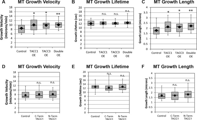 Figure 3. TACC1 overexpression (OE) increases MT growth velocities. Quantification of MT growth track parameters after TACC1 and TACC3 overexpression in cultured embryonic mesenchymal cells derived from neural tube. TACC proteins are expressed approximately twice as much as in controls. mKate2‐EB1 localizes to the ends of growing MTs and is thus a marker for MT polymerization. Automated tracking of mKate2‐EB1 comets is used to calculate MT growth track velocity (A), MT growth track lifetime (B), and MT growth track length (C). Mean values for all the experiments combined (three were performed in total): MT growth velocity, control, 8.5 µm/min, TACC1 OE 10.1 µm/min, TACC3 OE 9.84 µm/min, double OE 10.1 µm/min; MT growth lifetime, control, 12.1 s, TACC1 OE 12.3 s, TACC3 OE 12.3 s, double OE 12.5 s; MT growth length, control, 1.8 µm, TACC1 OE 2.1 µm, TACC3 OE 2.1 µm, double OE 2.2 µm. Control data are the means of 26 cells, representing a total of 4292 analyzed MT growth tracks; TACC1 OE are from 35 cells and 7606 analyzed MT growth tracks; TACC3 OE are from 38 cells and 9138 MT growth analyzed tracks; double OE are from 30 cells and 7214 MT growth analyzed tracks. (D–F) Quantification of MT parameters after overexpression of TACC1 deletion constructs. Mean values: MT growth velocity, control, 7.7 µm/min, C‐term TACC1 8.1 µm/min, N‐term TACC1 8.2 µm/min; MT growth lifetime, control, 12.7 s, C‐term TACC1 12.3 s, N‐term TACC1 12.8 s; MT growth length, control, 1.7 µm, C‐term TACC1 1.7 µm, N‐term TACC1 1.8 µm. Control data are the means of 40 cells (from 5 individual experiments), representing a total of 9425 analyzed MT growth tracks; C‐term TACC1 data are from 33 cells and 6960 analyzed MT growth tracks; N‐term TACC1 data are from 46 cells and 9701 analyzed MT growth tracks. Box‐and‐whisker plots indicate the mean (diamond), median, extrema, and quartiles. An unpaired t test was performed to assess significance of overexpression conditions compared to control. **P < 0.01, *P < 0.05; n.s., not significant.
