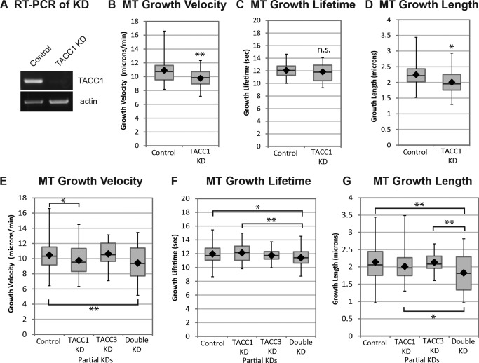 Figure 4. TACC1 KD reduces MT growth velocities, while double KD of both TACC1 and TACC3 also reduces MT growth lifetime. Quantification of MT growth track parameters after TACC1 and TACC3 knockdown in cultured embryonic mesenchymal cells derived from neural tube. (A) RT‐PCR demonstrates knockdown of normal TACC1. Automated tracking of mKate2‐EB1 comets after TACC1 knockdown is used to calculate MT growth track velocity (B), MT growth track lifetime (C), and MT growth track length (D). Mean values: MT growth velocity, control, 10.9 µm/min, TACC1 KD 9.8 µm/min; MT growth lifetime, control, 12.1 s, TACC1 KD 11.8 s; MT growth length, control, 2.2 µm, TACC1 KD 2.0 µm. Control data are the means of 52 cells, representing a total of 12,947 analyzed MT growth tracks; TACC1 KD are from 24 cells and 9435 analyzed MT growth tracks. (E–G) Quantification of MT parameters after double TACC1/TACC3 knockdowns (TACC1 mRNA levels were reduced approximately 25% while TACC3 was reduced approximately 40%, not shown). Mean values: MT growth velocity, control, 10.5 µm/min, TACC1 partial KD 9.7 µm/min, TACC3 partial KD 10.6 µm/min, TACC1/TACC3 double partial KD 9.4 µm/min; MT growth lifetime, control, 12.0 s, TACC1 partial KD 12.1 s, TACC3 partial KD 11.8 s, TACC1/TACC3 double partial KD 11.4 s; MT growth length, control, 2.1 µm, TACC1 partial KD 2.0 µm, TACC3 partial KD 2.1 µm, TACC1/TACC3 double partial KD 1.8 µm. Control data are the means of 92 cells (from 5 individual experiments), representing a total of 25,266 analyzed MT growth tracks; TACC1 partial KD are from 80 cells and 22,637 analyzed MT growth tracks; TACC3 partial KD are from 31 cells and 8,143 analyzed MT growth tracks; TACC1/TACC3 double partial KD are from 44 cells and 21,531 analyzed MT growth tracks. Box‐and‐whisker plots indicate the mean (diamond), median, extrema, and quartiles. To determine statistical significance for panels E–G, an ANOVA test was performed first (which revealed that the means were not the same for any condition), followed by an unpaired t‐test to assess significance between conditions. **P < 0.01, *P < 0.05; n.s., not significant.