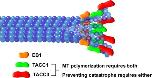 Figure 5. Cartoon schematic of TACC localization at the MT plus‐end. Our data suggest a model in which TACC3 (red) is at the distal‐most end, with TACC1 (green) overlapping with and slightly proximal to TACC3. EB1 (orange) lies further proximal to TACC1. Both TACC1 and TACC3 are required for maintaining normal rates of MT polymerization, while normal levels of either of TACC1 or TACC3 appears to be sufficient for preventing MT catastrophe. Note that it is still unclear whether TACC3 and TACC1 can bind to the plus‐end independently of other factors, or whether other +TIPs are required (such as XMAP215, which interacts directly with TACC3). Not drawn to scale.