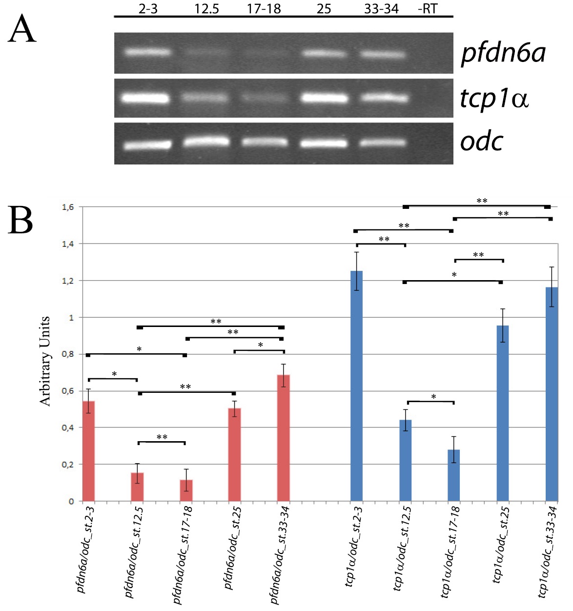 (A) pfdna6 and tcp1α expression during embryonic development. cDNA derived from Xenopus