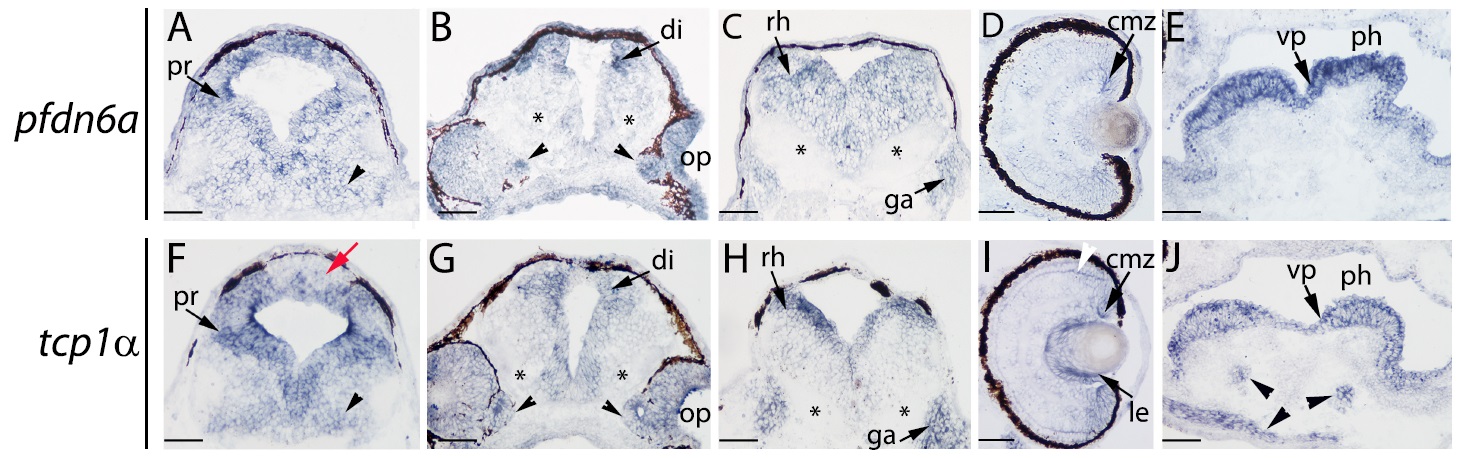 (F-J). The red arrow in (F) denotes absence of tcp1α signal in a dorsal region of prosencephalon.