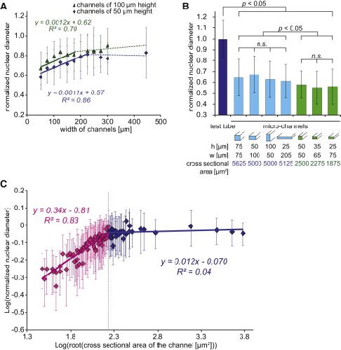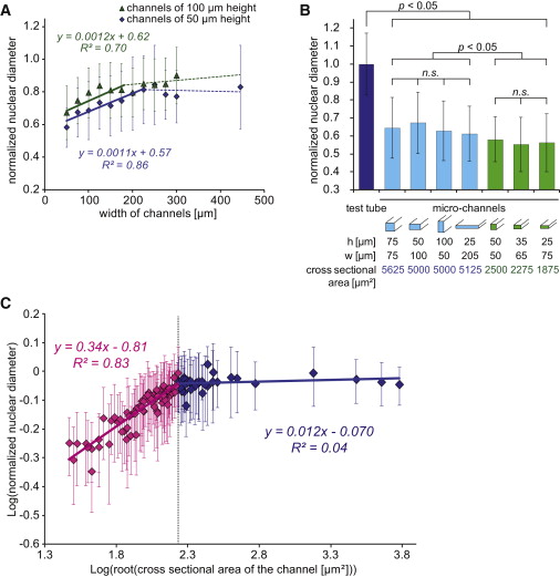 (B) Normalized diameters of nuclei incubated in channels with approximately constant cross-sectional areas (light blue, ∼5,500 μm2; light green, ∼2,200 μm2) but varying height/width ratios. n.s., no significant difference. See also Table S1.