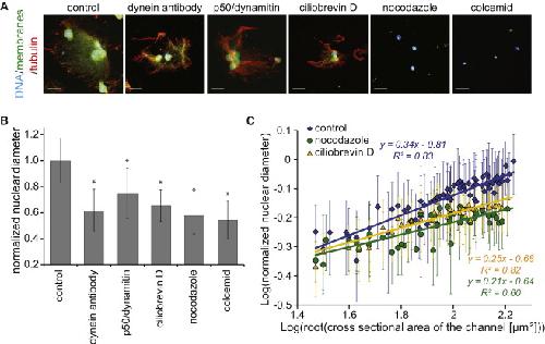 (C) Normalized diameters of nuclei incubated for 120 min in total (80 min in the presence of inhibitors in micro-channels; nocodazole, green; ciliobrevin D, yellow) plotted against the square root of the cross-sectional area of the micro-channels using a log-log plot. Each dataset was fitted to linear regressions. The strength of correlation for nocodazole and ciliobrevin D is significantly weaker compared with the control (blue) (p < 0.05). Data represent the mean ± SD.