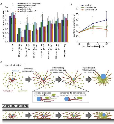 (C) Putative mechanism controlling nuclear expansion in the absence of any spatial constraint (top) and under spatial constraints (bottom).