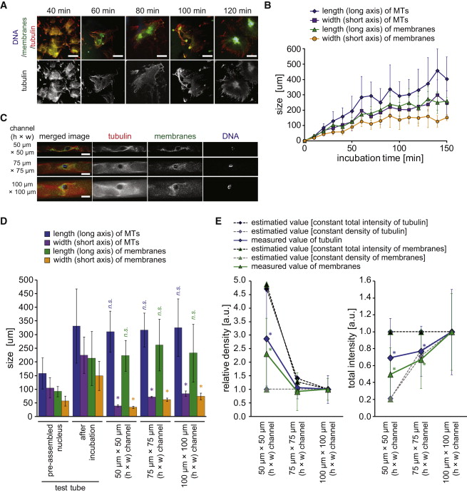 (E) Relative density (left) and total intensity (right) of tubulin (blue) and membranes (green) within their occupied spaces inside the channels. Estimated values are based on assuming either constant density (black) or constant total intensity (gray) within the occupied spaces. The relative density and total intensity were normalized to values obtained for 100 × 100 μm (h × w) channels. ∗p < 0.05 compared with samples in 100 × 100 μm (h × w) channels. Data represent the mean ± SD.