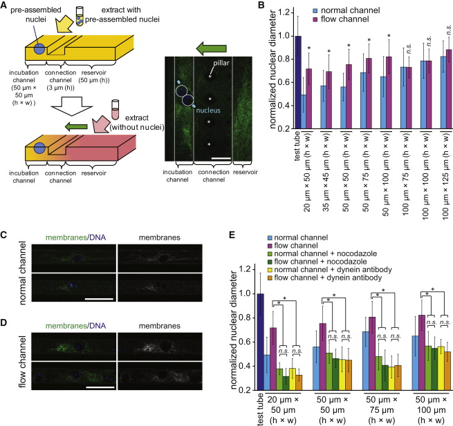 (A) Flow channel. After the crude cytoplasmic extract with the pre-assembled nuclei was injected into the incubation channel, fresh crude cytoplasmic extract without any nuclei was injected continuously into the large reservoir. During this period, the cytoplasm could diffuse freely and flow from the reservoir into the incubation channels through shallow connection channels. Green, DiOC6(3); blue, Hoechst 33342; asterisk, pillar in the connection channels. Scale bar, 50 μm.