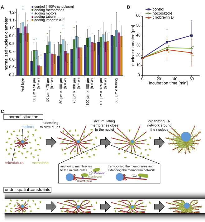 (A) Normalized diameters for nuclei supplemented with extra membranes, MT-binding motors, tubulin, or importin α-E recombinant protein and incubated in normal micro-channels. ∗p < 0.05 compared with samples without supplements. Data represent the mean ± SD.