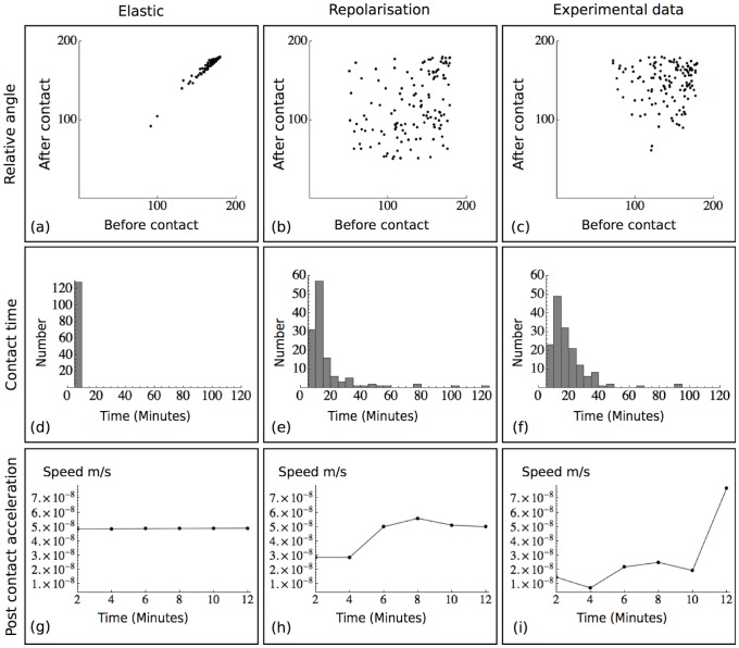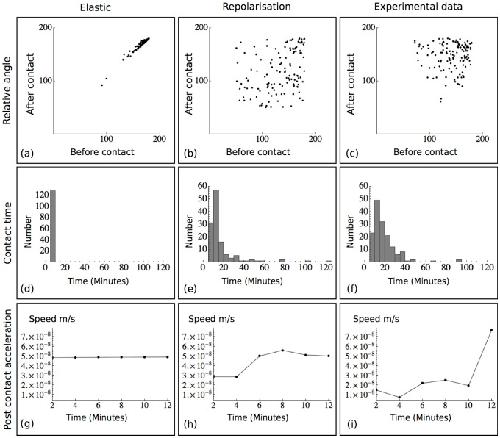 Figure 2. Calibration to in vitro data.(a). Relative angle of the normal force elastic collision model, representing equal mass impulse momentum. (b). Relative angle of the repolarization model. (c). Relative angle of the biological data. (d). Contact time for the normal force elastic collision model. (e). Contact time for the repolarization model. (f). Contact time for the real cell data. (g). Mean speed after contact separation of the normal force elastic collision model. (h). Mean speed after contact separation for the repolarization model. Note that the speed does not increase past the default migratory speed due to the self-propulsion force term. (i). Mean speed after contact separation for the real cell data, average over 4 cells.