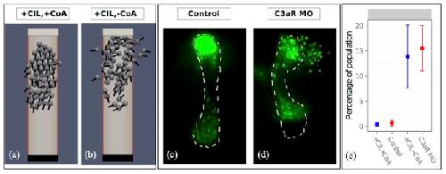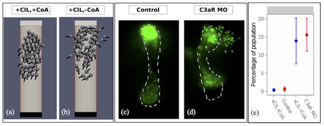 Figure 6. Co-attraction facilitates stream guidance.(a). +CIL,+CoA, cells respond to the restrictive cues and remain in the migratory region. (b). +CIL,−CoA, cells neglect restrictive cues and migrate into the restricted region. (c). Control NC cells migrating in vivo. (d). C3aR MO cells migrating in vivo. In this case single cells cross into restricted regions. (e). Quantification on the percentage of the population that has moved into the restricted region throughout simulation (blue) and in vitro experiment (red).